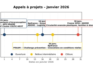 Le guide intègre également une légende pratique (porteurs éligibles, type de dispositif, calendrier avec dates de relève et de clôture) afin d’identifier immédiatement les opportunités pertinentes et leurs échéances.